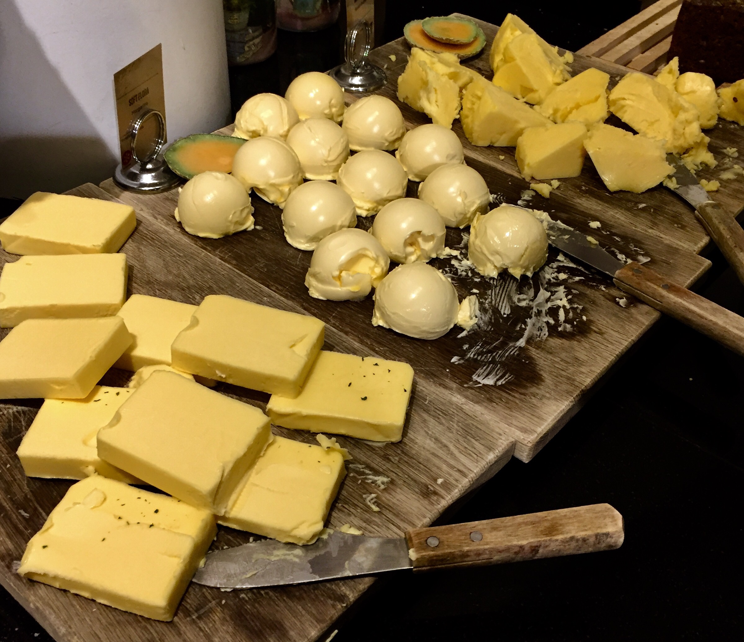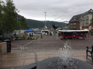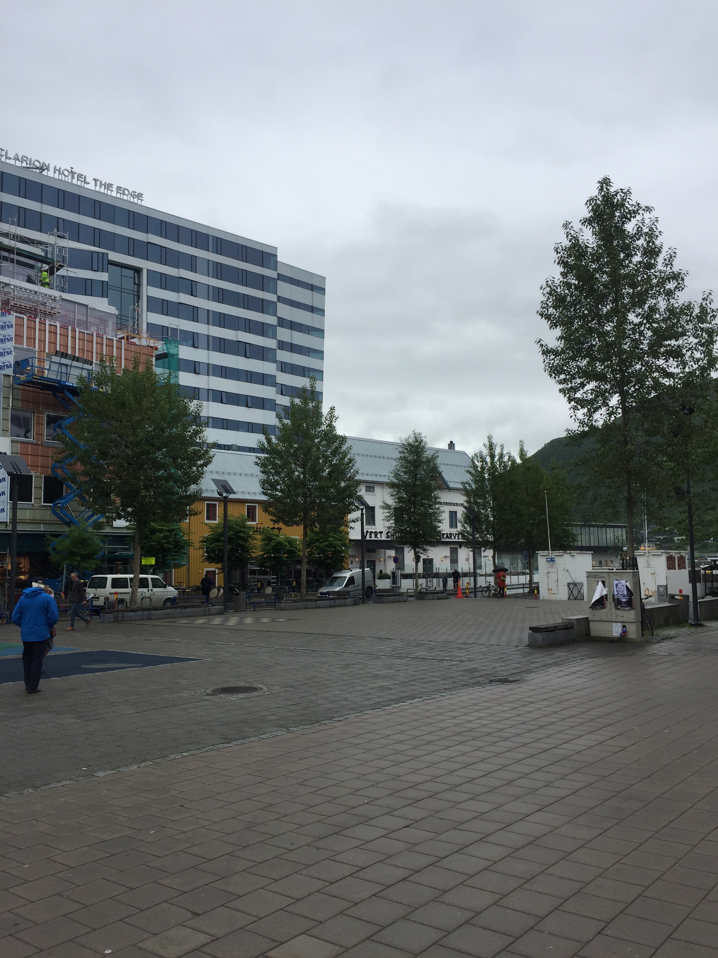 Ikke mye å se til sommeren i Tromsø, selv om datoen viser juli. Under 10 grader varmt og godt synlig snø på fjellene rundt byen viser at sommeren er anderledes her nord. Vi nyter uansett vår første feriedag, blant annet med en deilig frokost på hotel Clarion The Edge. Blant annet utvalget av smør er ikke helt som hjemme på en mandag morgen.