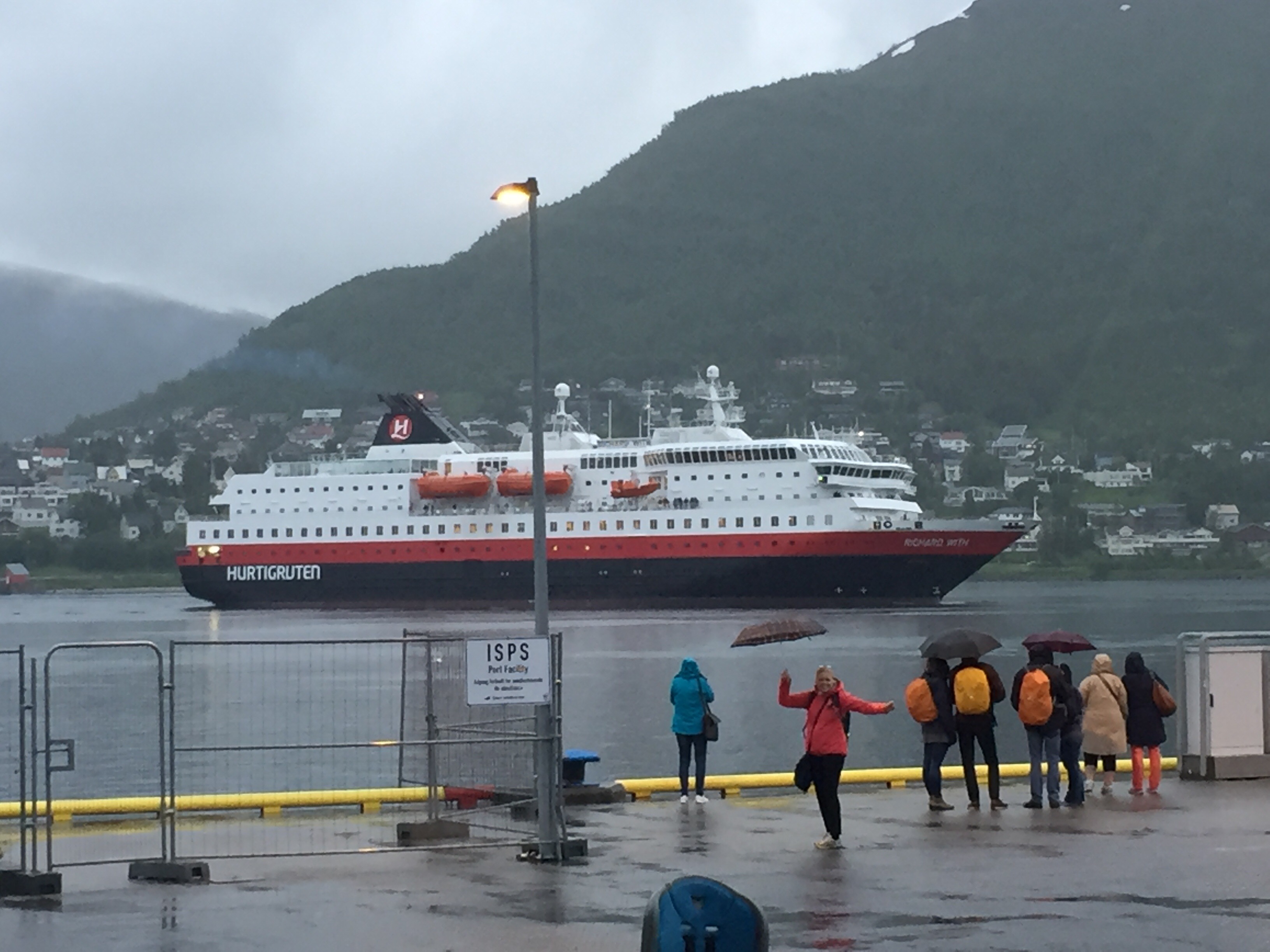 Etter en lang dags venting i Tromsø er jeg klar for en reise med en norsk institusjon. Hurtigruta har alltid vært tilstede i min levetid og vel så det, så det er med spenning jeg ser MS Richard With legger til i Tromsø havn. Overraskende lite fasiliteter ved kaien i Tromsø og vi må stå i regnværet og vente på landgangen og at alle passasjerer skulle komme seg ut. I Tromsø ligger Hurtigruta til kai i god tid så mange passer på å oppleve Tromsø, men til slutt kunne vi riste av oss regnet og god ombord.