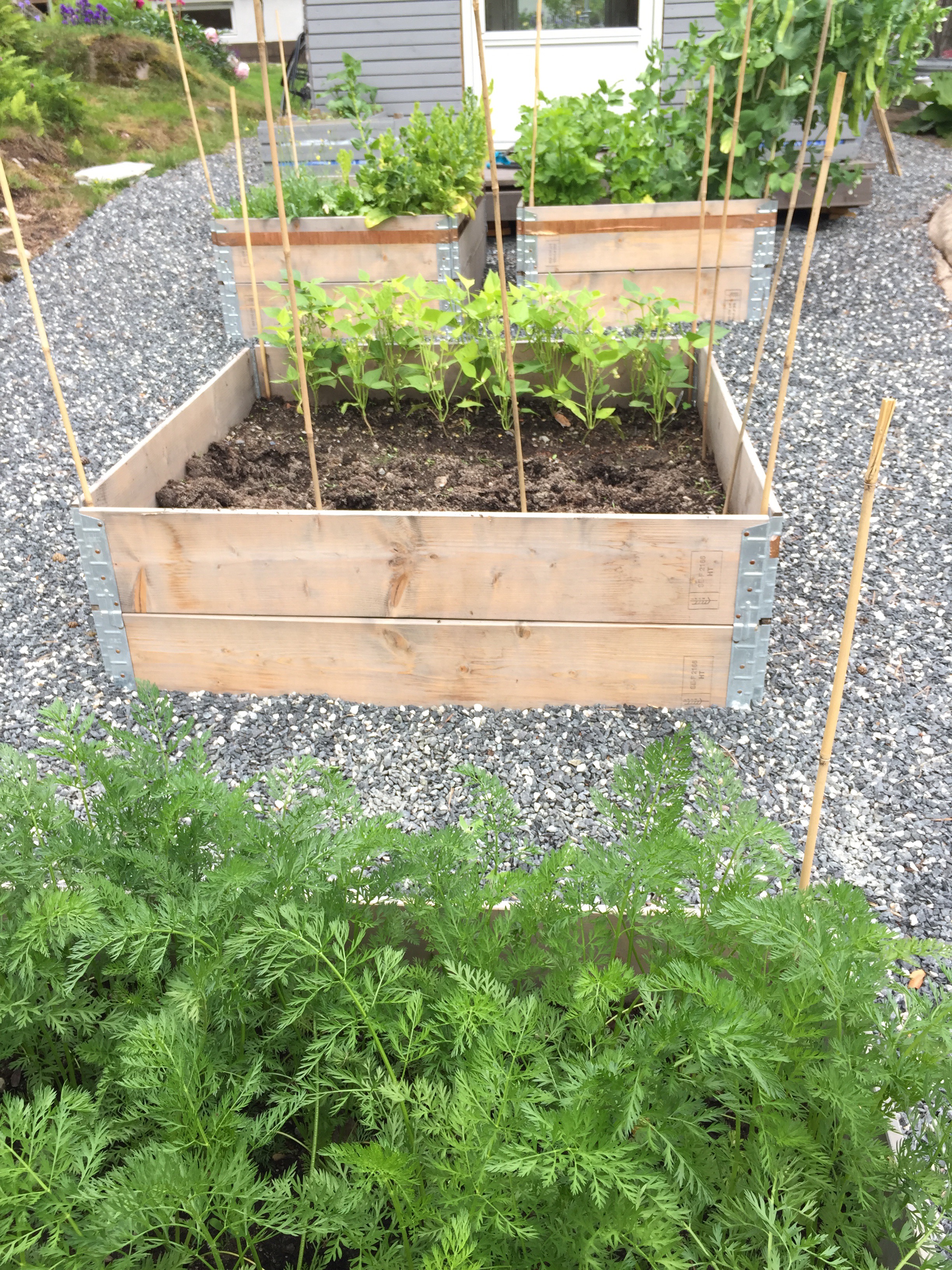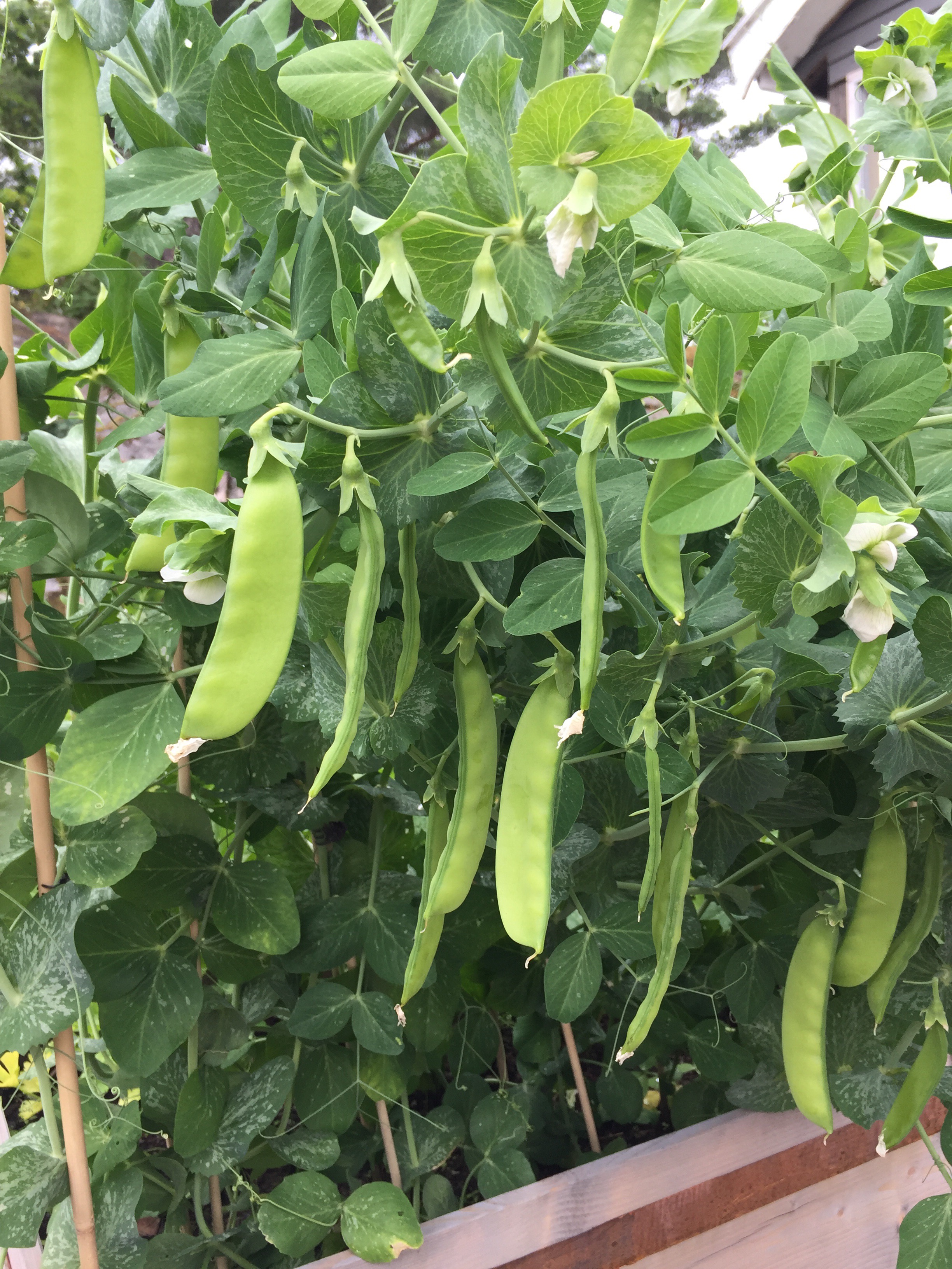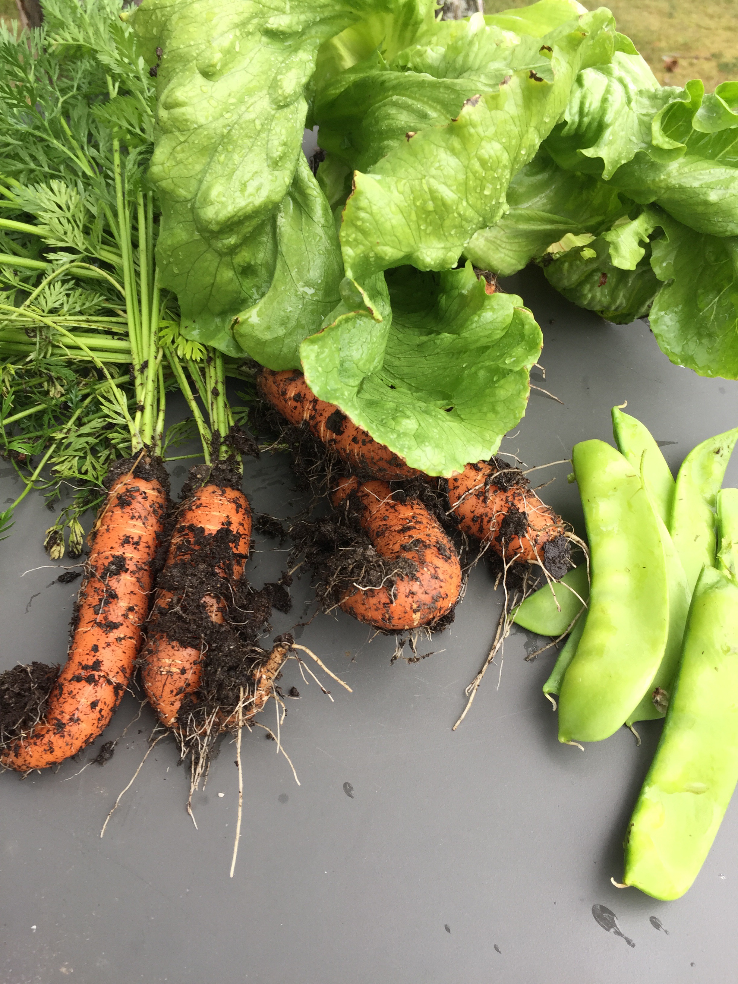 Gulerøttene har imidlertid blitt store nok til å spises og sukkerertene er også klare. En god følelse å plukke egne grønnsaker som er plantet, gjødslet og vannet av oss.