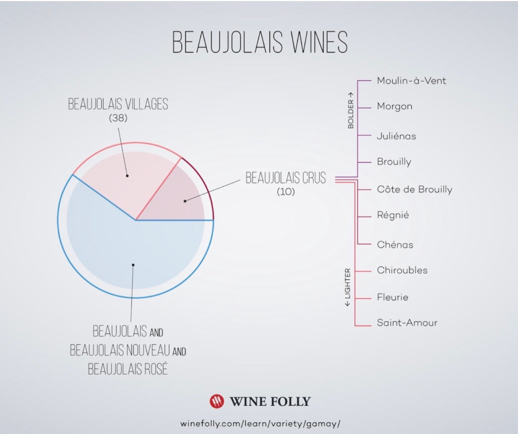 Det er definert 10 ulike Cru, som altså er definerte områder innen vindistriktet hvor det dyrkes druer som har høyere kvalitet og som gir en rikere råmateriale for å produsere vin. Alle viner i Beaujolais produseres av druen Gamay, noe som betyr at smaksforskjeller skyldes jordsmonnet hvor vinplanten vokser og arbeidet som gjøres etter innhøsting. Bildet under som er hentet fra Wine Folly viser de ulike Crus som finnes i Beaujolais.