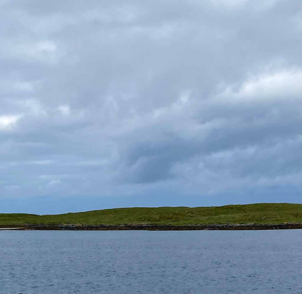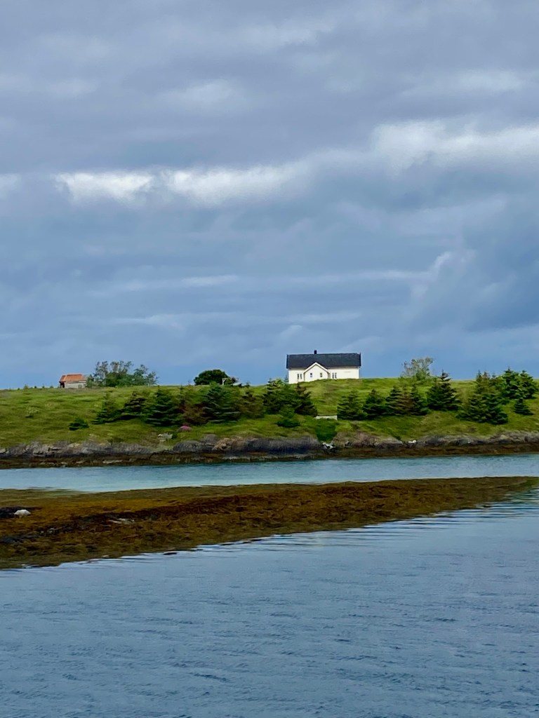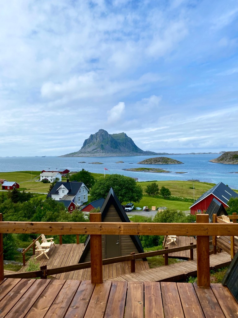 På terrassen nyter vi utsikten utover havet og øya Søla i sommersol. Stillheten er kun avbrutt av ivrige fugler som haster forbi. Vi nyter tilværelsen og opplever å bo som en Ærfugl. Det er ekstra godt etter 1364 trappetrinn.