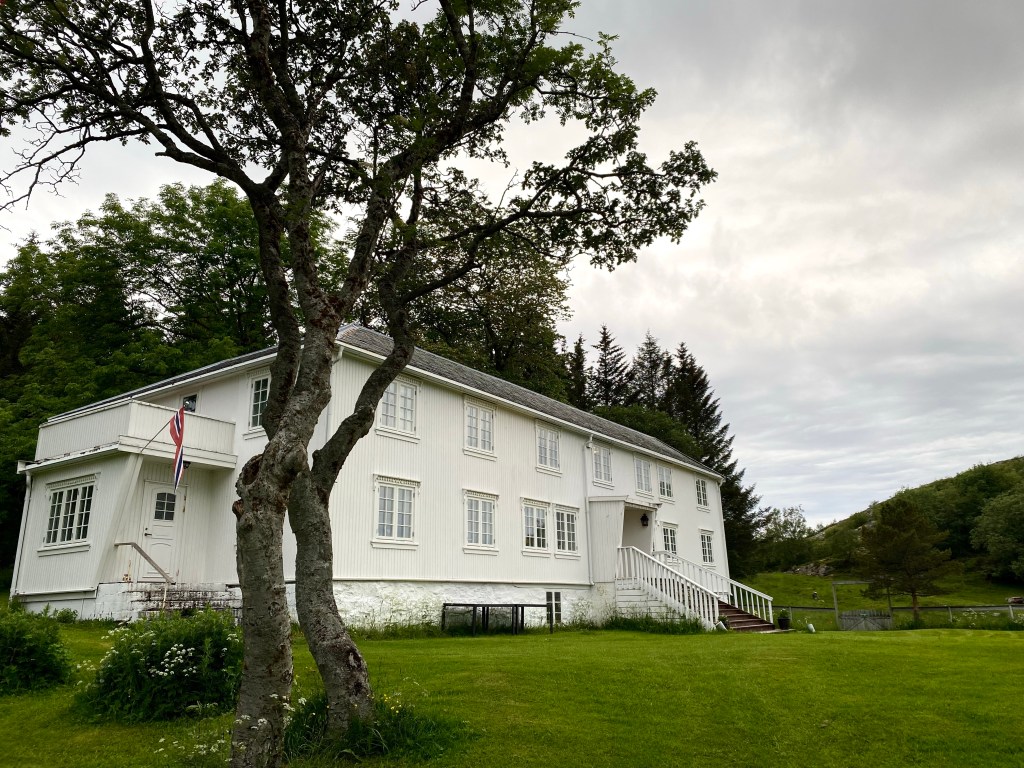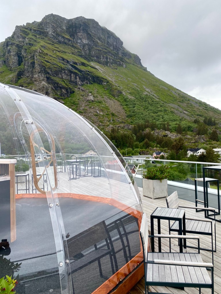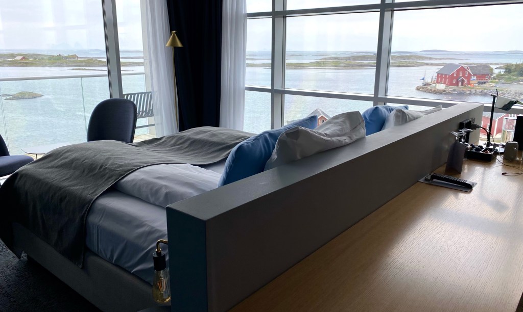 De buede veggene på Lovund Hotel gav en tydelige fornemmelse av å bevege seg inne i ett skip og rommet var som å komme inn på broen av skipet. Moderne design, blåfargede vegger med matchene sengetøy på sengen som var plassert mitt i rommet, lokket oss til å plane ut og beskue havet gjennom glassvinduer som fylte veggene i rommet. Dette var en helt annen opplevelse enn vi hadde dagen før på herregården fra begynnelsen av 1800 tallet og glamping dagen etter. Deilig med variasjoner og så mange ulike inntrykk i løpet av bare tre døgn.