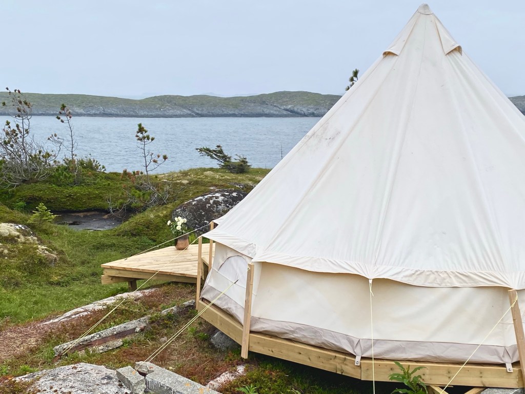 Nattens kraftige vind hadde bygd opp mye grov sjø og turen til Myken via Træna var røff. Den smale veien, eller kanskje mer riktig gangstien på Myken, var også vindfull når vi gikk opp til overnattingsstedet Myken seng og suppe. Sjøbodene og små hvite hus gav noen steder litt ly for vinden, men dette er ett værhardt sted. Den gamle nedlagte skolen var bygd om til B&B med tilbud om små rom, innendørs campingvogner og glamping. Vårt telt var innredet med dobbel seng, stol og bord og utsikt til havet gjennom teltåpningen.