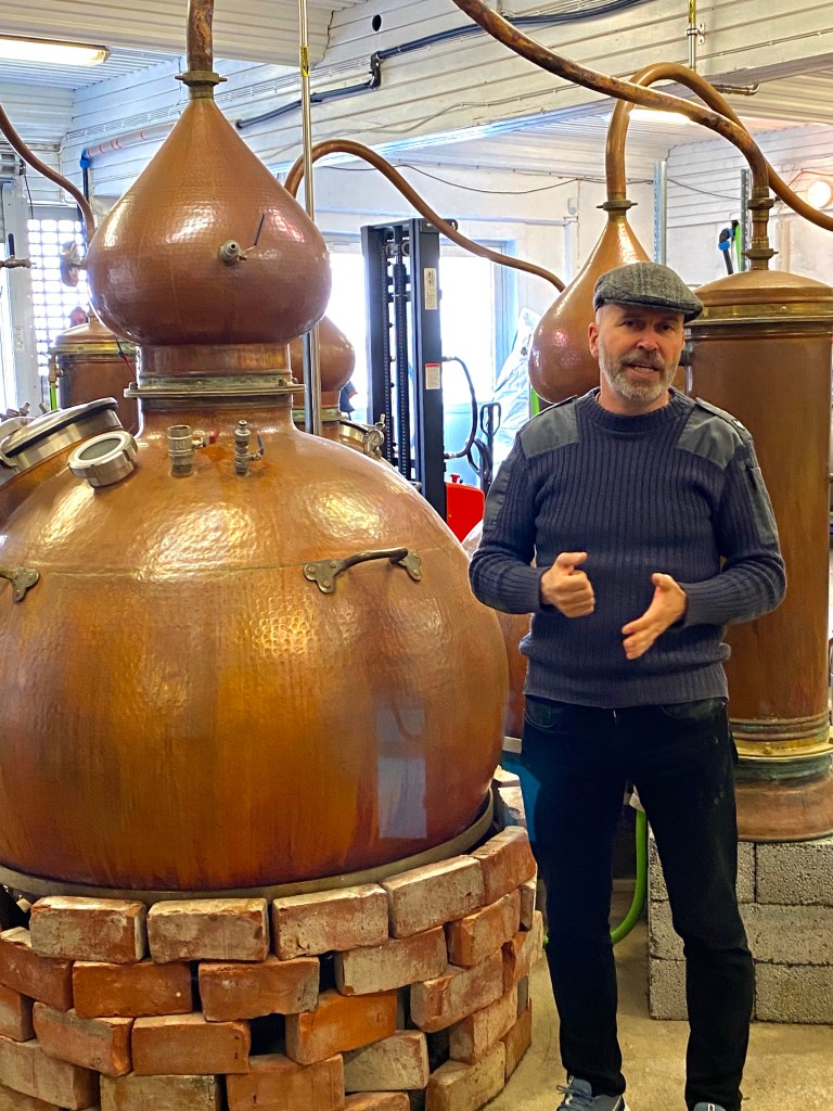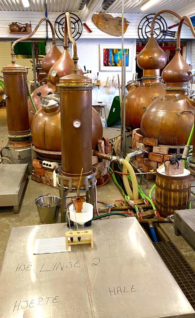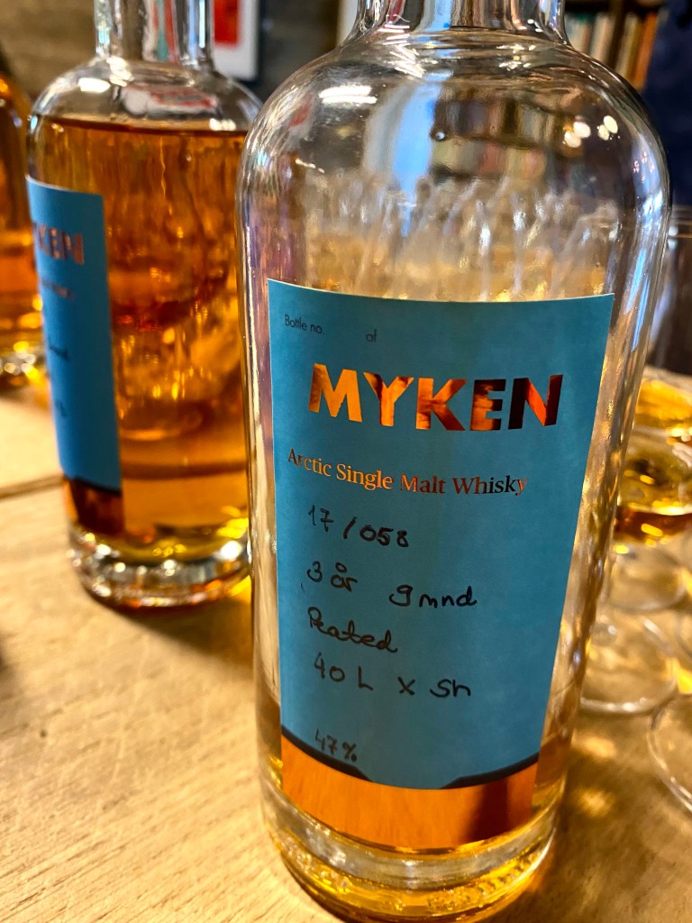 Tilfeldigheter skulle ha det til at Myken Destilleri ble en realitet. Værfast under en seilas til Lofoten ble initiativtakerne så forelsket i stedet at de måtte tilbake. Dette resulterte til slutt i flytting, ny bygging av hus og etablering av Myken Destilleri. Med innlevelse og tydelig lidenskap ble både produktene og prosessen forklart. Fra korn, vann og gjær til ferdig produkt ble vi guidet gjennom. Ved det rustikke langbordet blant alle bøkene fra øyas tidligere bibliotek, ble vi servert smaksprøver av både Whisky og Gin. Spesielt deres sommer gin falt veldig i smak og litt trist var det at vi ikke fikk være med på dugnad dagen etter. I det vi forlot Myken var det tappe-dugnad for en ny batch som skulle ut til utsolgte pol i Norge. Myken Destilleri er ett godt trekkplaster for øya og en viktig arbeidsplass som bidrar til liv og muliggjør fastboende på øya.